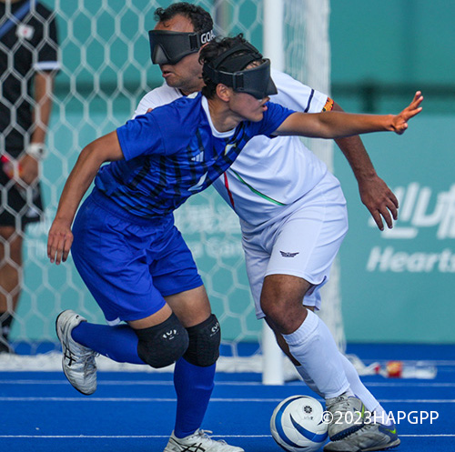 いわゆる「見えないサッカー」であり、ゴールキーパー以外の選手がアイマスクを装着し、「シャカシャカ」と音が出るボールを使用します。